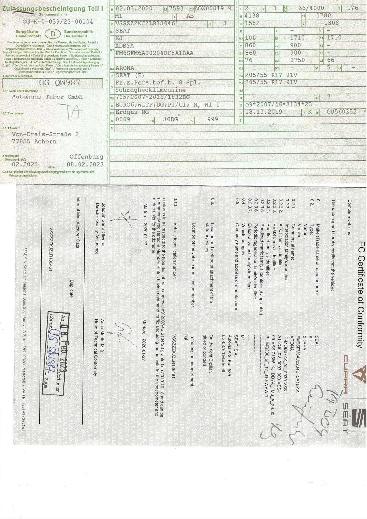 Duitse Brief / Kenteken - 1e Zulassung Duitsland 2-3-2020- Fabriek 2019
