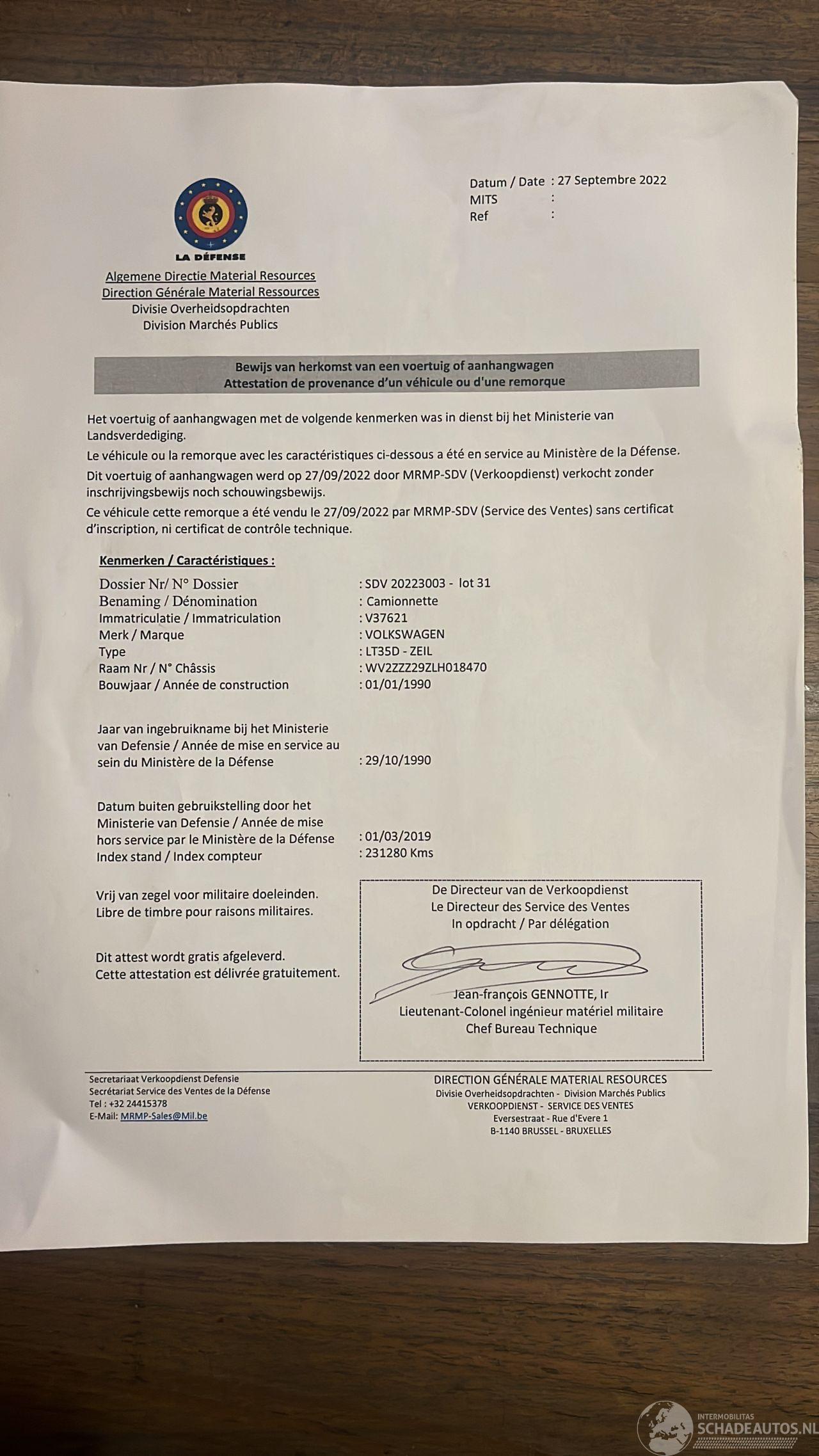 Volkswagen LT 35D Open Laadbak met huif rechtstreeks uit het Belgische Leger incl. alle Belgische leger documenten + aankoopfactuur aanwezig om hem eventueel op NL kenteken te zetten