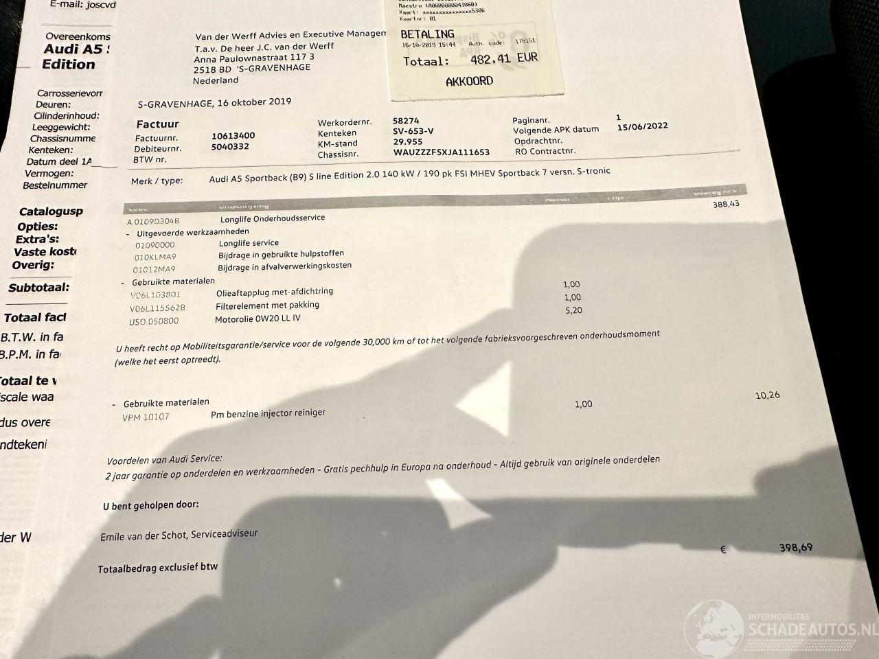 Bomvolle Sport Edition - AUTOMAAT + F1 flippers op stuurwiel - 1e eigenaar - complete historie van A tot Z aanwezig - DEALER ONDERHOUDEN - 3x S-Line - keyless entry + start - org NL auto + NAP + 2x sleutels op afstandbediening erbij - elektr achterklep - pdc voor + achter - xenon + led koplampen + led achterlichten - elektr achterklep - zwarte hemelbekleding - sportonderstel - metallic lak - 18 inch lmv - navi professioneel - 3 zones airco (climate control) + cruise control - licht + regensensor + aut dimmend binnenspiegel - audi presense botswaarschuwing (front assist) - line assist - verlichte instaplijsten - half lederen sportinterieur - S Line binnen + buiten - navi professioneel - in hoogte verstelbare + orthopedische stoelen voorzijde - bomvolle A5 Sportback 2.0 TFSI MHEV Sport S-line Edition die top is onderhouden